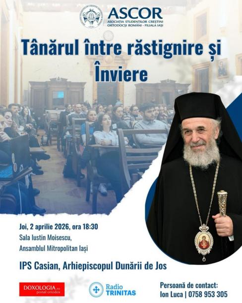 În intervalul orar 18.30-20.30, în Sala „Iustin Moisescu” din cadrul Ansamblului Mitropolitan, va avea loc o conferință cu tema „Tânărul între răstignire și Înviere”. Evenimentul este organizat de ASCOR Iași și îl are ca invitat pe Înaltpreasfințitul Părinte Casian, Arhiepiscopul Dunării de Jos. Întâlnirea se adresează voluntarilor ASCOR Iași, studenților, precum și publicului larg.