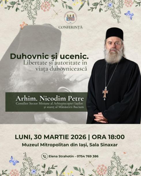 De la ora 18.00, la Muzeul Mitropolitan din Iași, în Sala Sinaxar, se va desfășura ultima conferință din seria celor trei seri duhovnicești susținute în perioada Postului Mare. Evenimentul este organizat de Asociația „Prietenii Sfinților Trei Ierarhi” și îl are ca invitat pe părintele arhim. Nicodim Petre, consilier al Sectorului Misiune al Arhiepiscopiei Iașilor și stareț al Mănăstirii Bucium, care va susține o conferință cu tema „Duhovnic și ucenic. Libertate și autoritate în viața duhovnicească”.